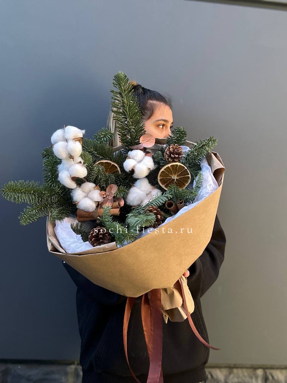Веточки датского нобилиса образуют пышную основу, где каждый элемент находит своё место. Сушёные апельсины и палочки корицы добавляют тёплые оттенки, хлопок создаёт мягкие акценты, а шишки завершают композицию природными формами.