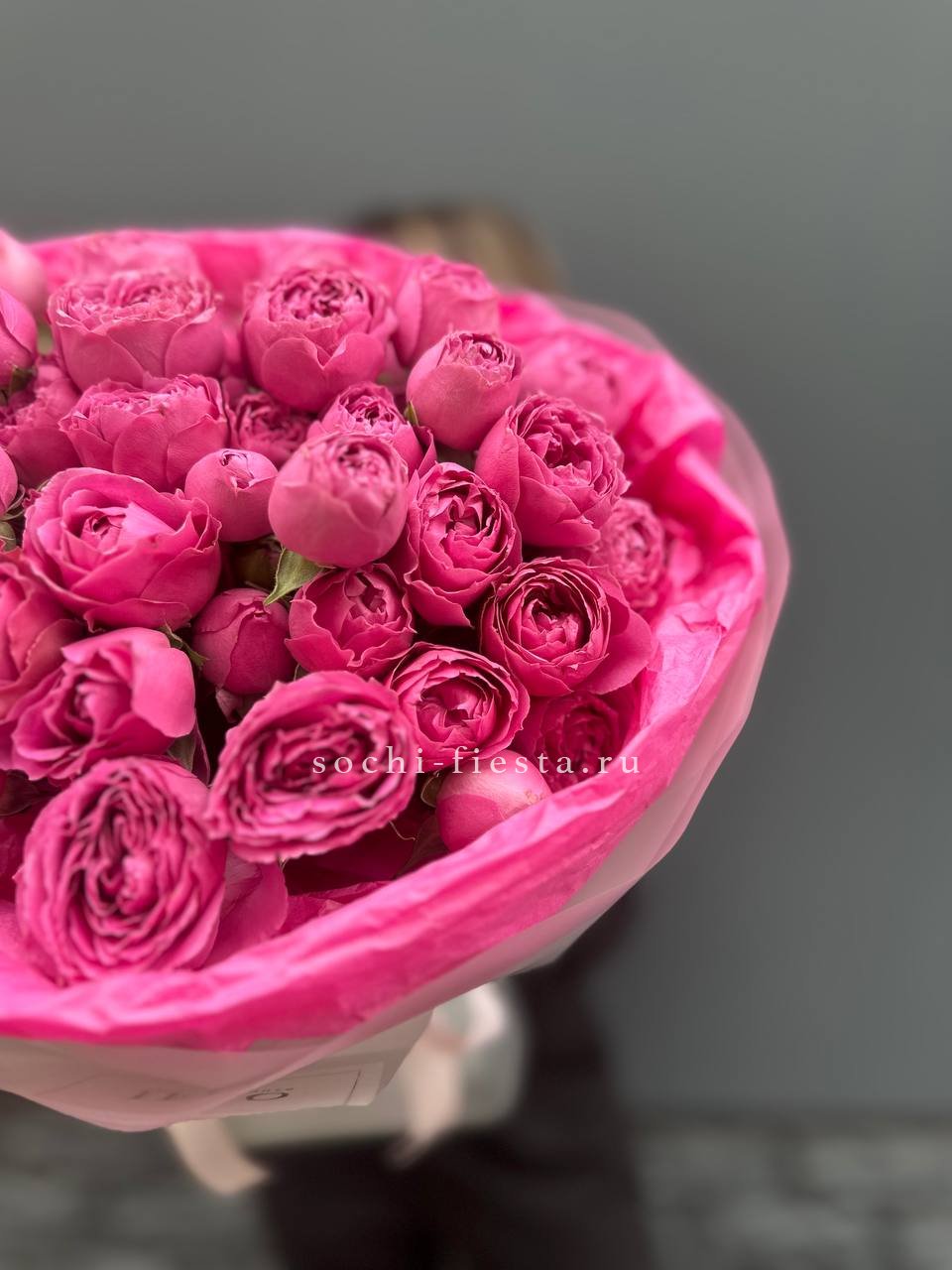 Густая охапка Джумилии с плотно собранными бутонами заполняет пространство сочным пурпурно-розовым оттенком. Свободная сборка без жесткой формы создает живое впечатление свежесрезанных цветов.