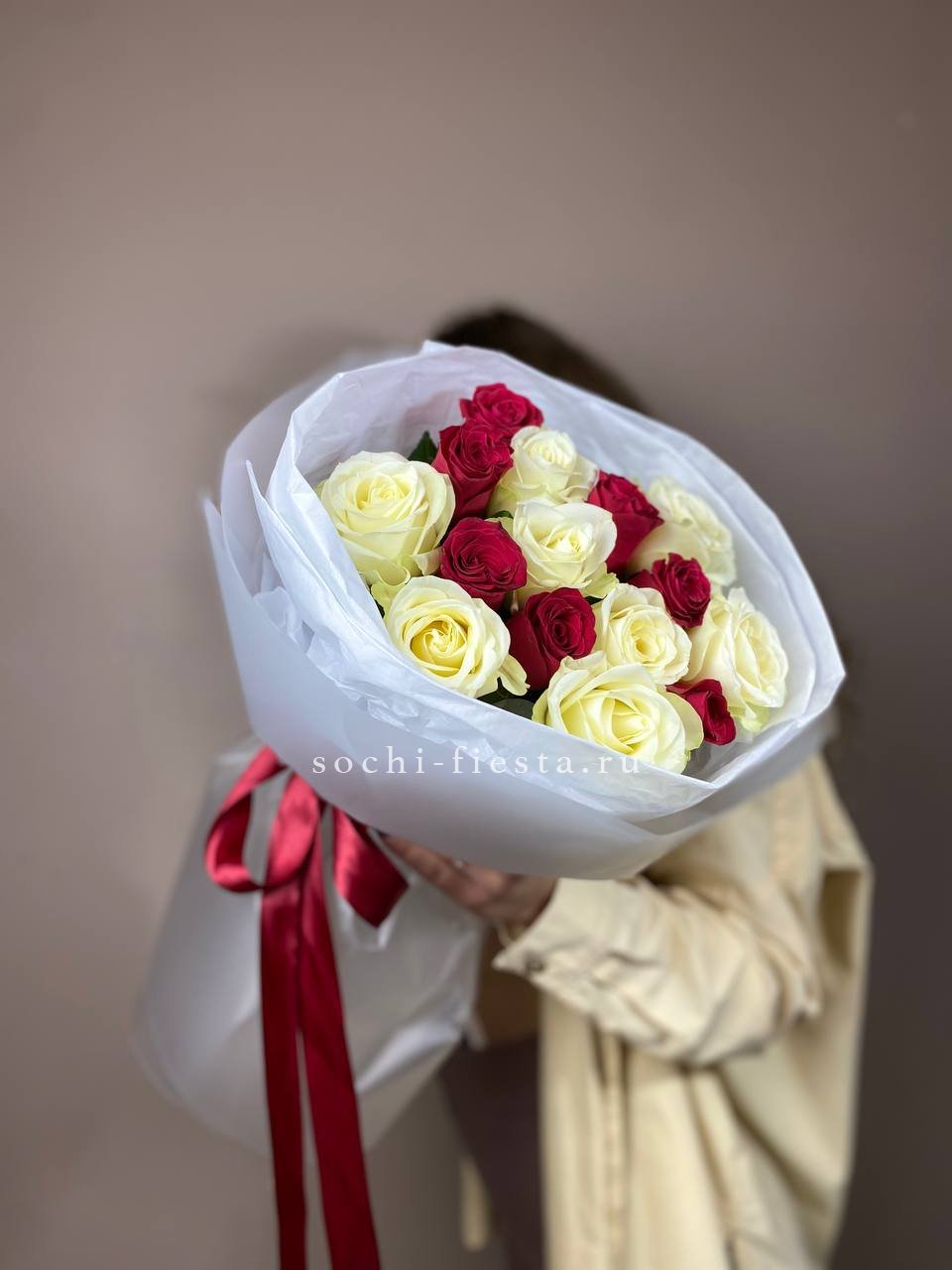Мягкая игра оттенков между белым и розовым создает объемную глубину букета. Пятьдесят один бутон выстраивается в плотную структуру, где каждый цвет усиливает звучание соседнего без резких границ.