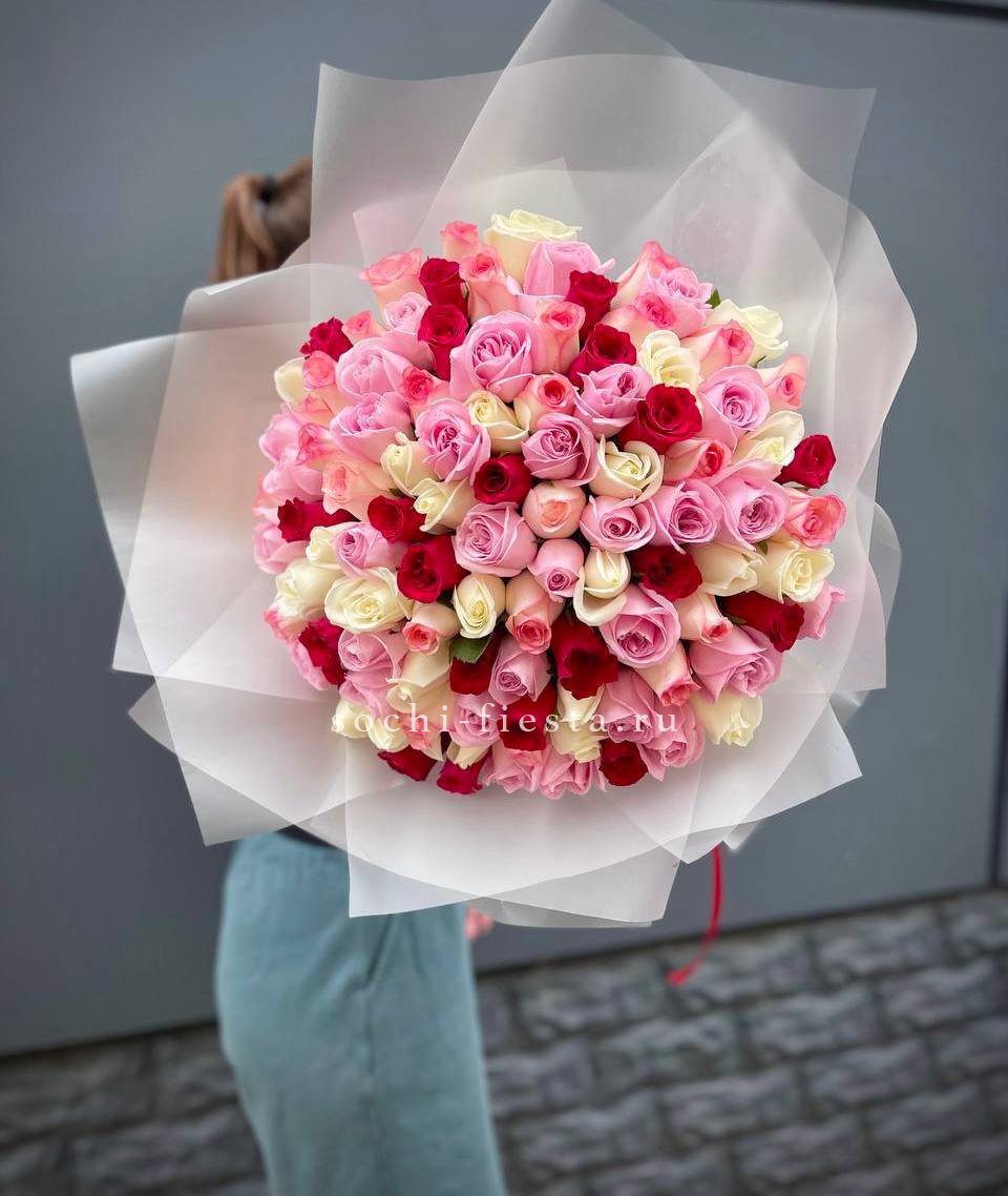 101 роза разноцветных оттенков, лента, упаковка на выбор.