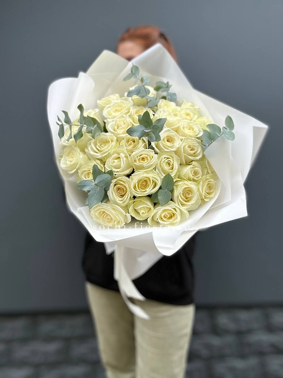 25 белых роз, сухоцветы, дизайнерская упаковка.