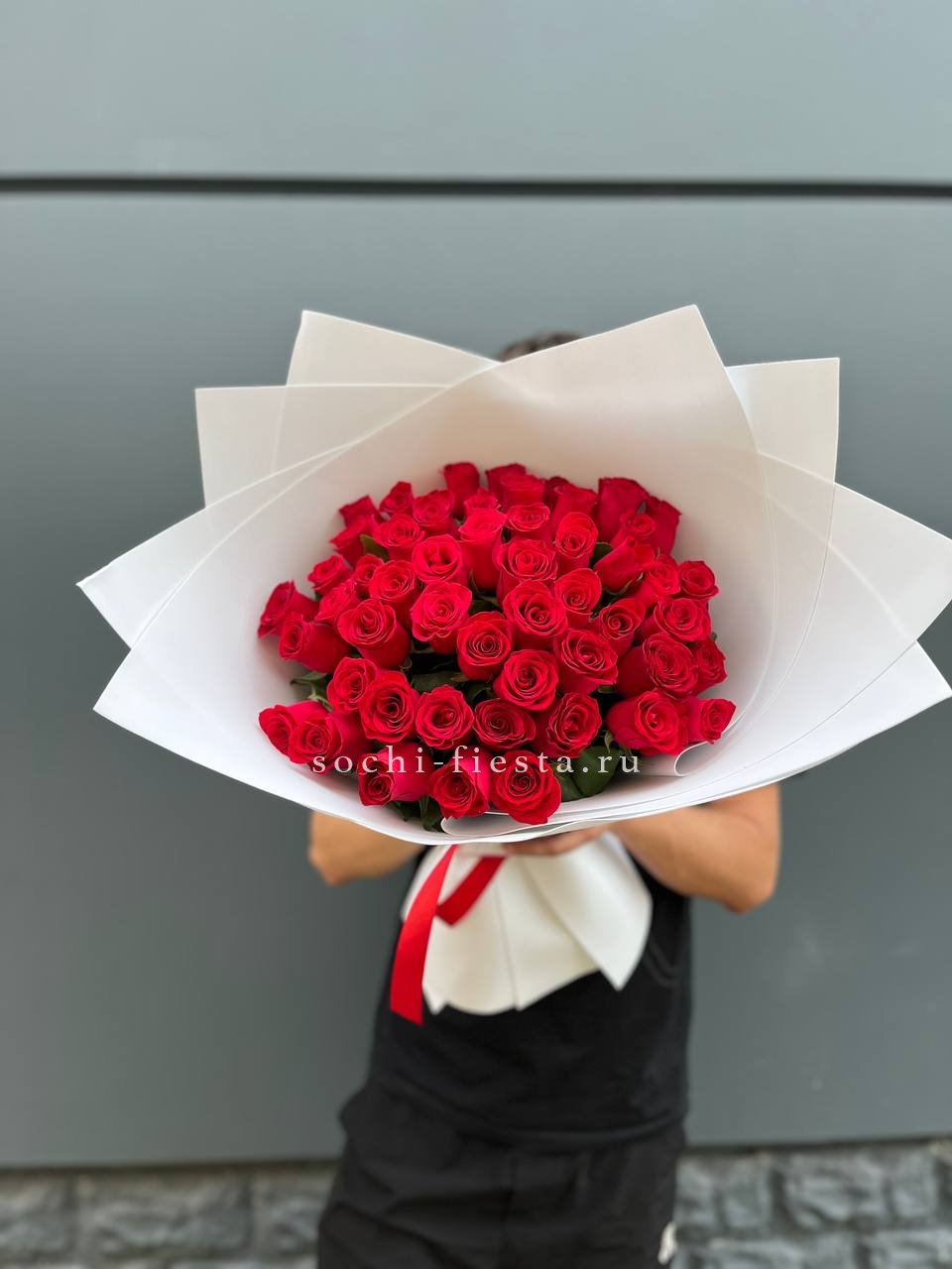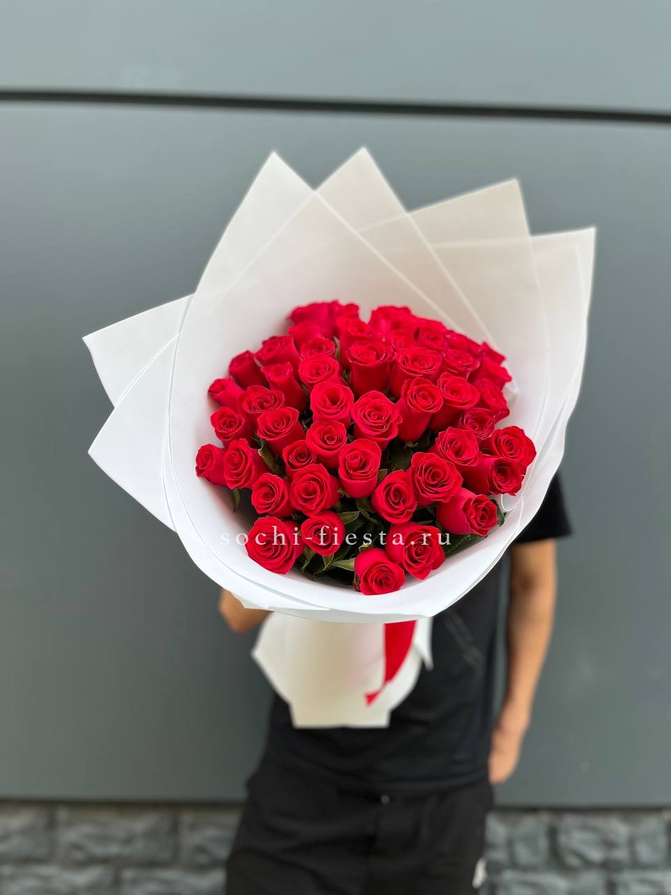 Плотная сборка из пятидесяти одной розы создает насыщенное красное пятно с глубокой фактурой лепестков. Дизайнерская упаковка удерживает форму и добавляет графичности общему силуэту.