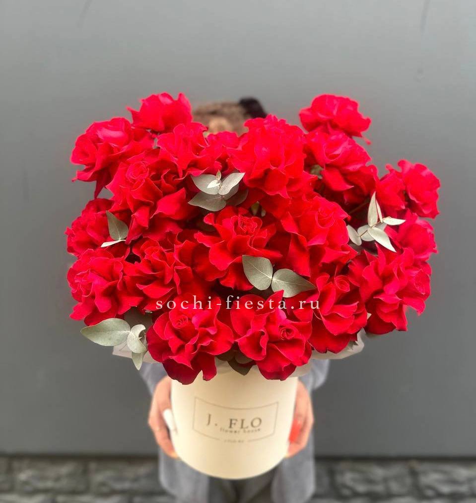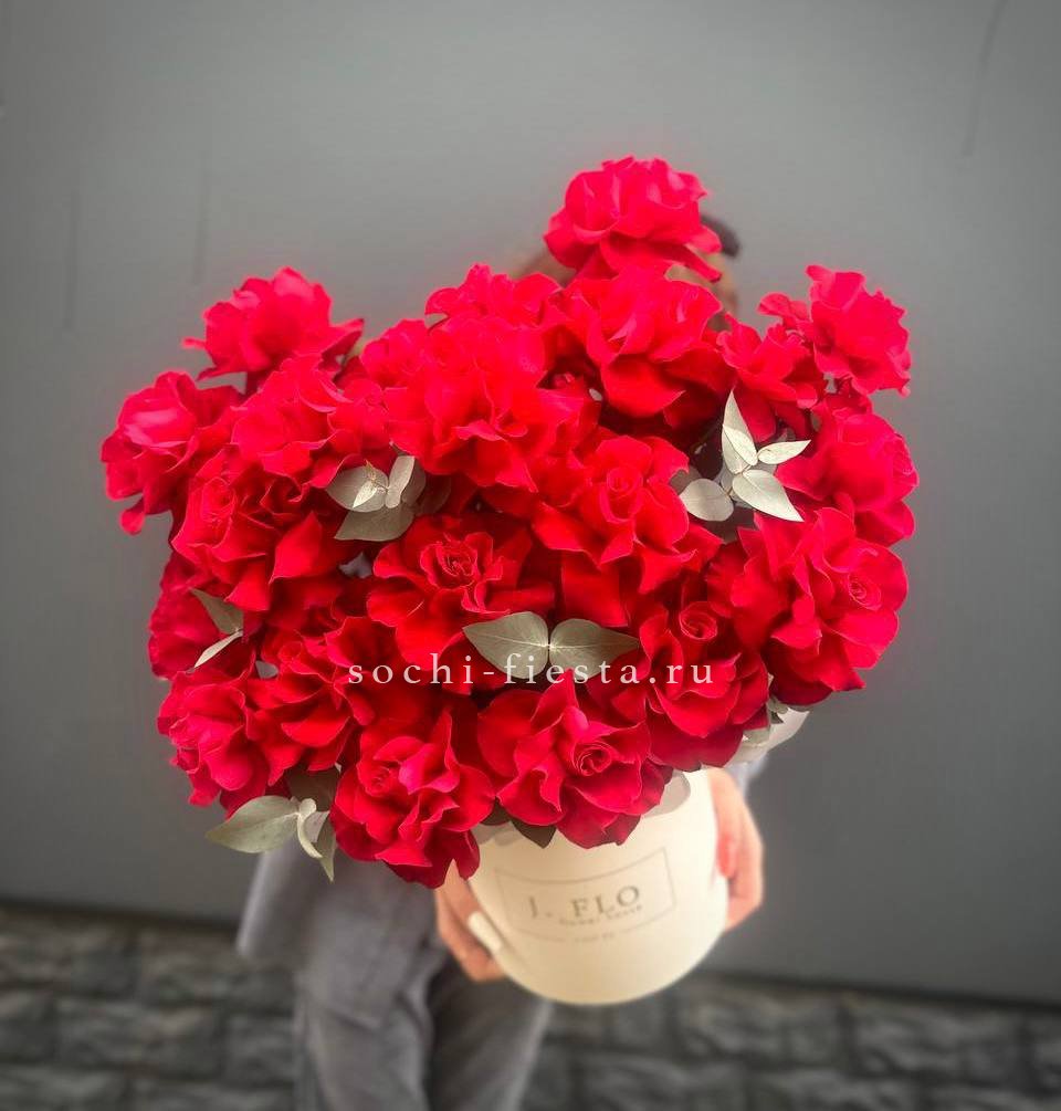 Одиннадцать французских роз с вывернутыми лепестками раскрывают всю глубину бутона. Насыщенный красный цвет и графичная форма создают яркое присутствие.