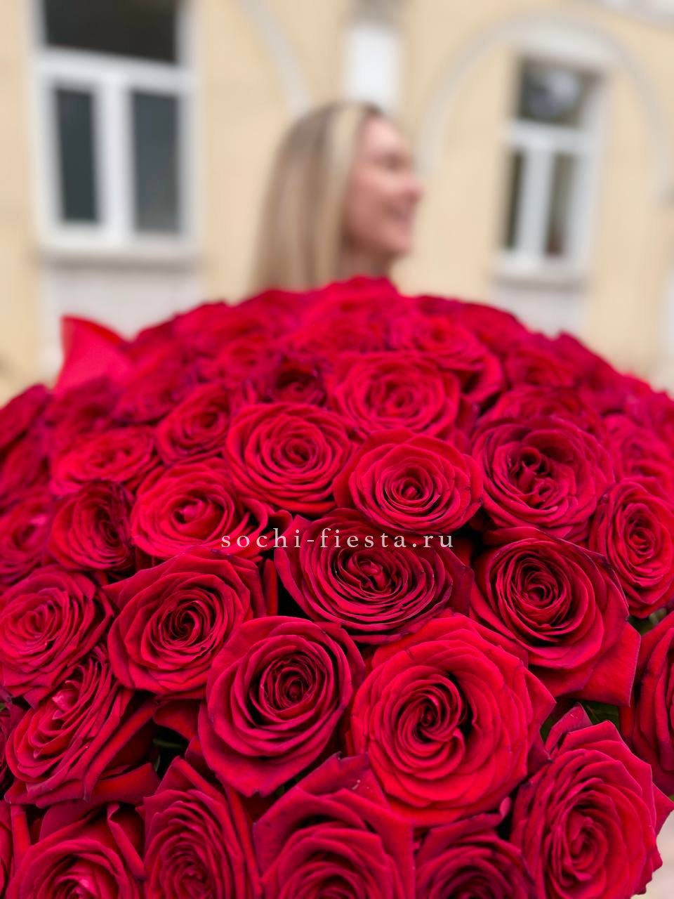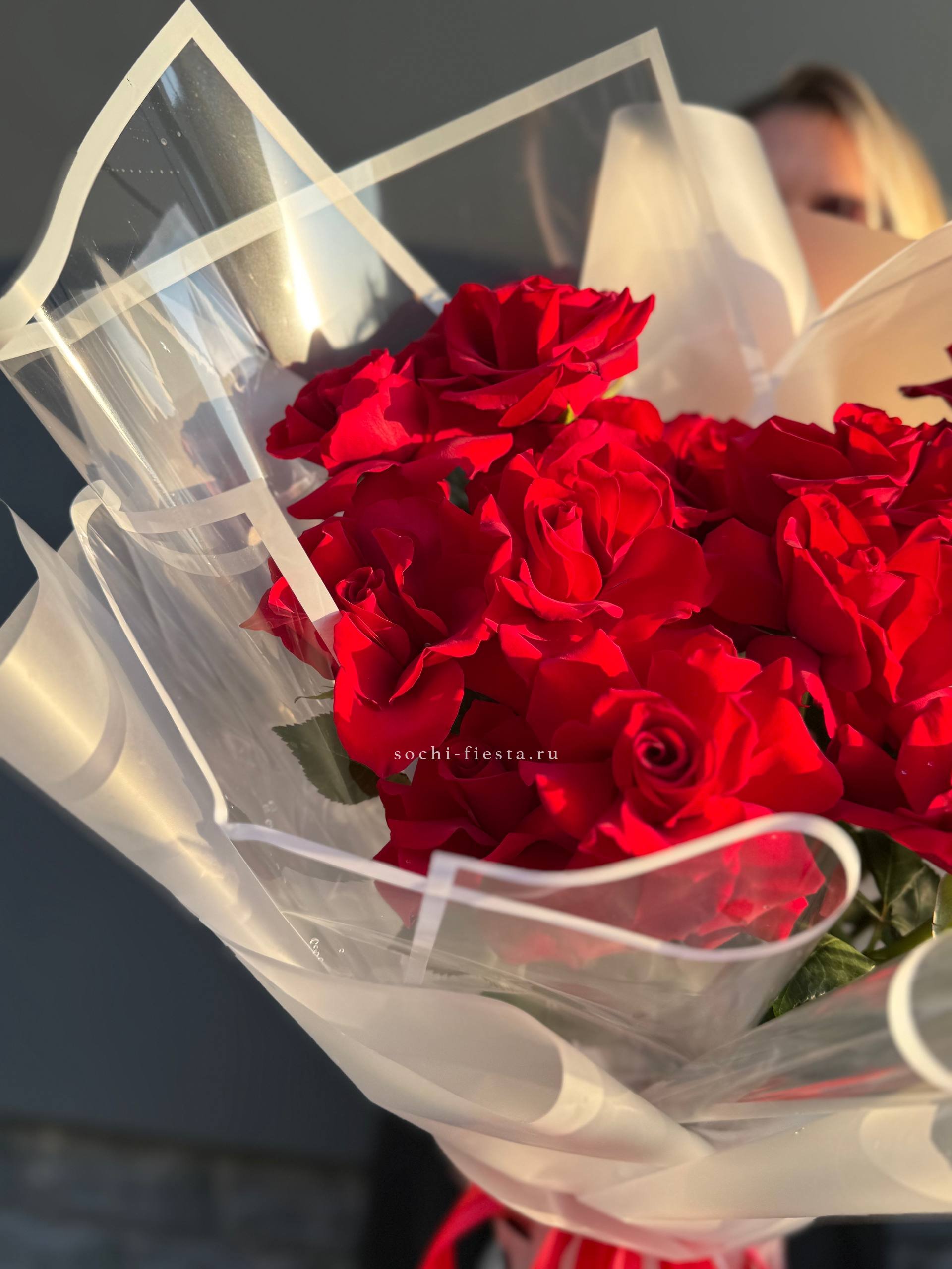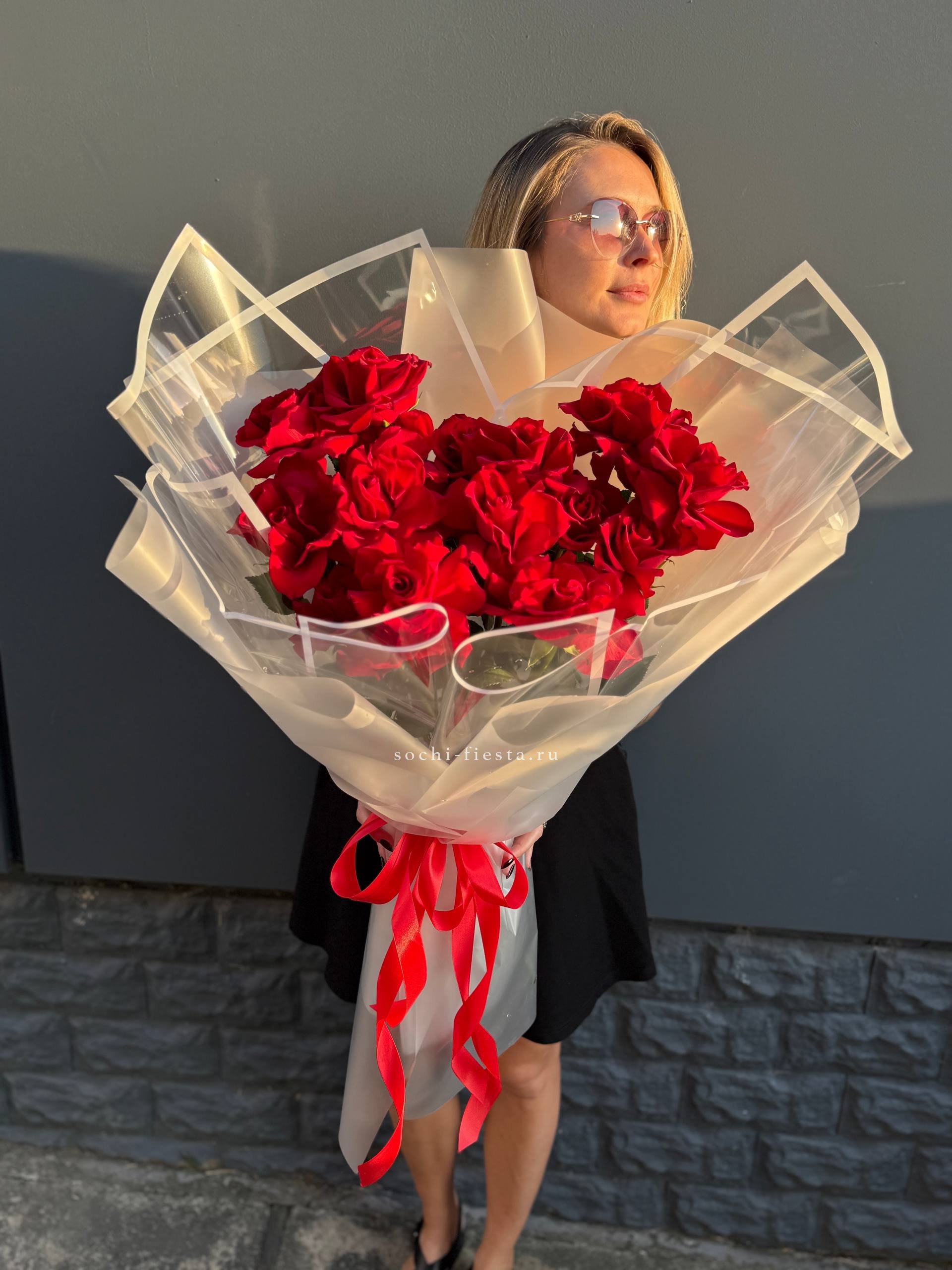 Compliment — это двадцать пять красных роз на длинных стеблях, собранных в классическую форму. Букет держит форму несколько дней и остаётся аккуратным даже в высокой вазе.