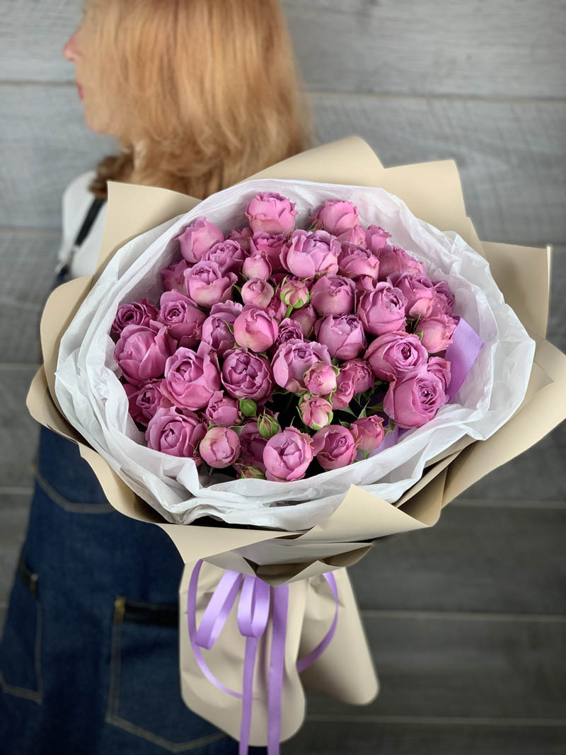 15 кустовых роз, лента, крафт.