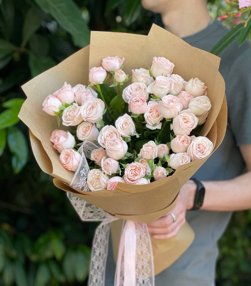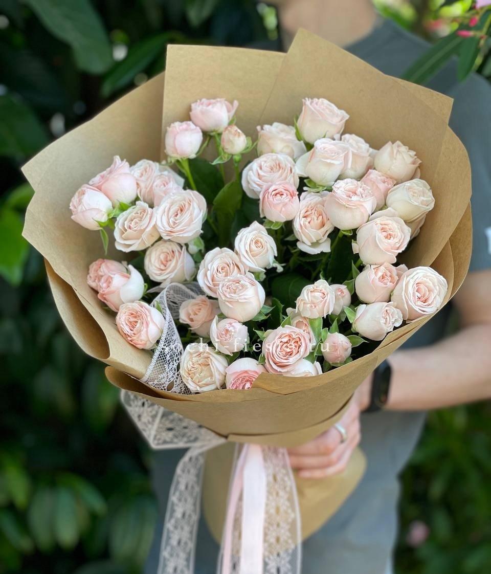 пионовидные розы Бомбастик нежных оттенков, лента, упаковка.
