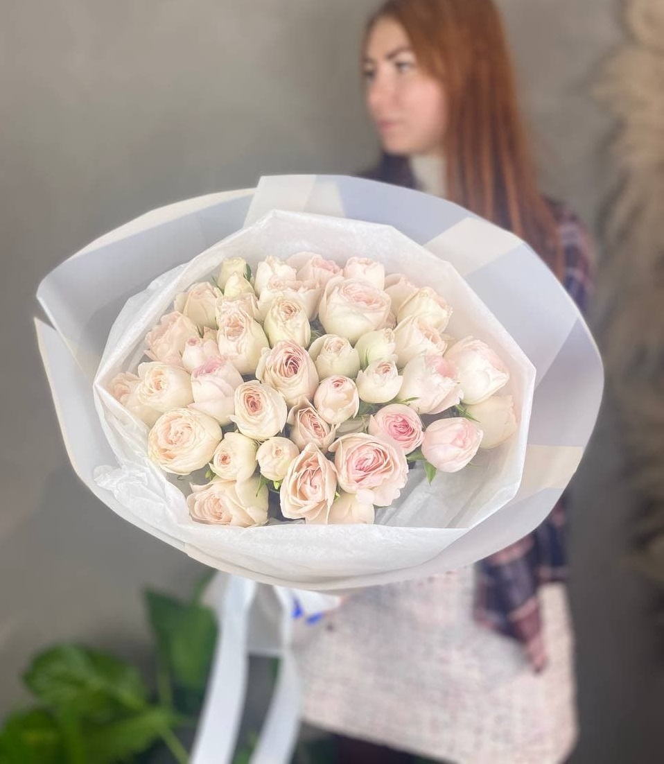 11 пионовидных кустовых роз Bombastic (или Porcelain Lace), дизайнерское оформление, лента.