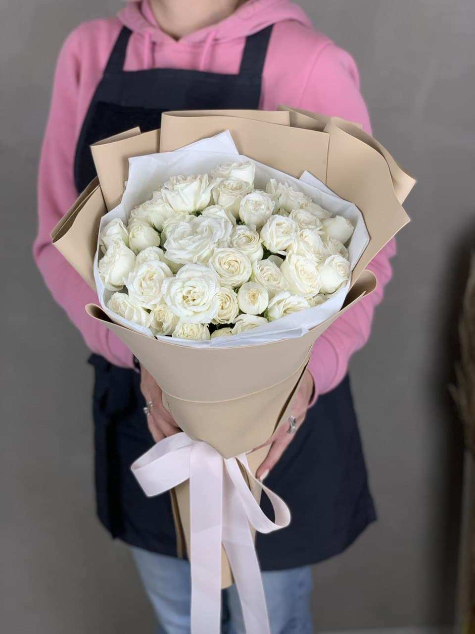 13 пионовидных кустовых роз Lady Bombastic, лента, тишью, фоамиран.