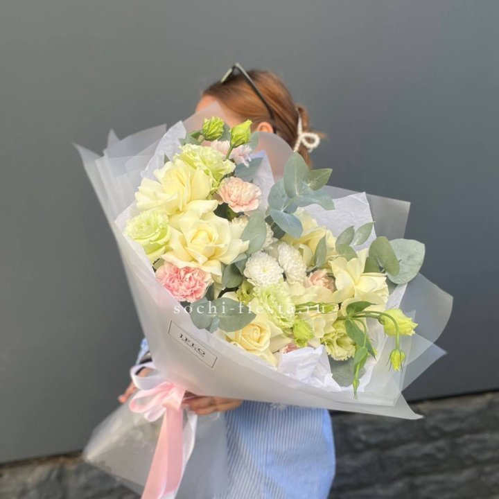 Основа сборных букетов в Якутске: розы (Freedom, Mondial, Avalanche), хризантема кустовая, альстромерия, эустома, фрезия, вероника. Дополнительно — ранункулюсы в сезон, хризантема одиночная, ирис весной, тюльпаны в апреле. Состав зависит от текущей поставки и сезона. Флорист всегда предлагает то, что в лучшей форме прямо сейчас.
