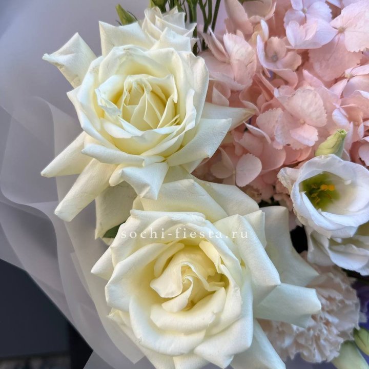 Основа сборных букетов в Якутске: розы (Freedom, Mondial, Avalanche), хризантема кустовая, альстромерия, эустома, фрезия, вероника. Дополнительно — ранункулюсы в сезон, хризантема одиночная, ирис весной, тюльпаны в апреле. Состав зависит от текущей поставки и сезона. Флорист всегда предлагает то, что в лучшей форме прямо сейчас.