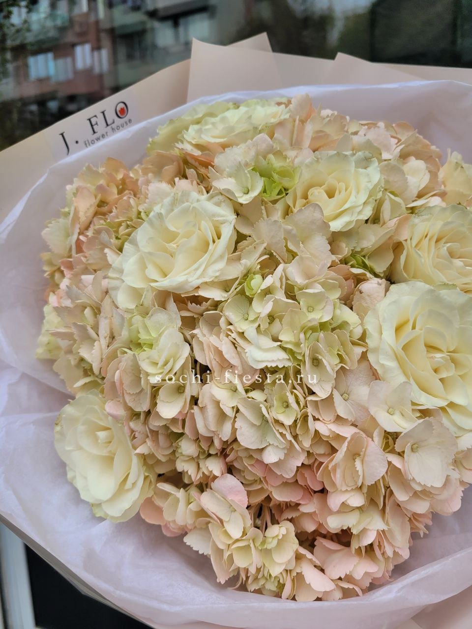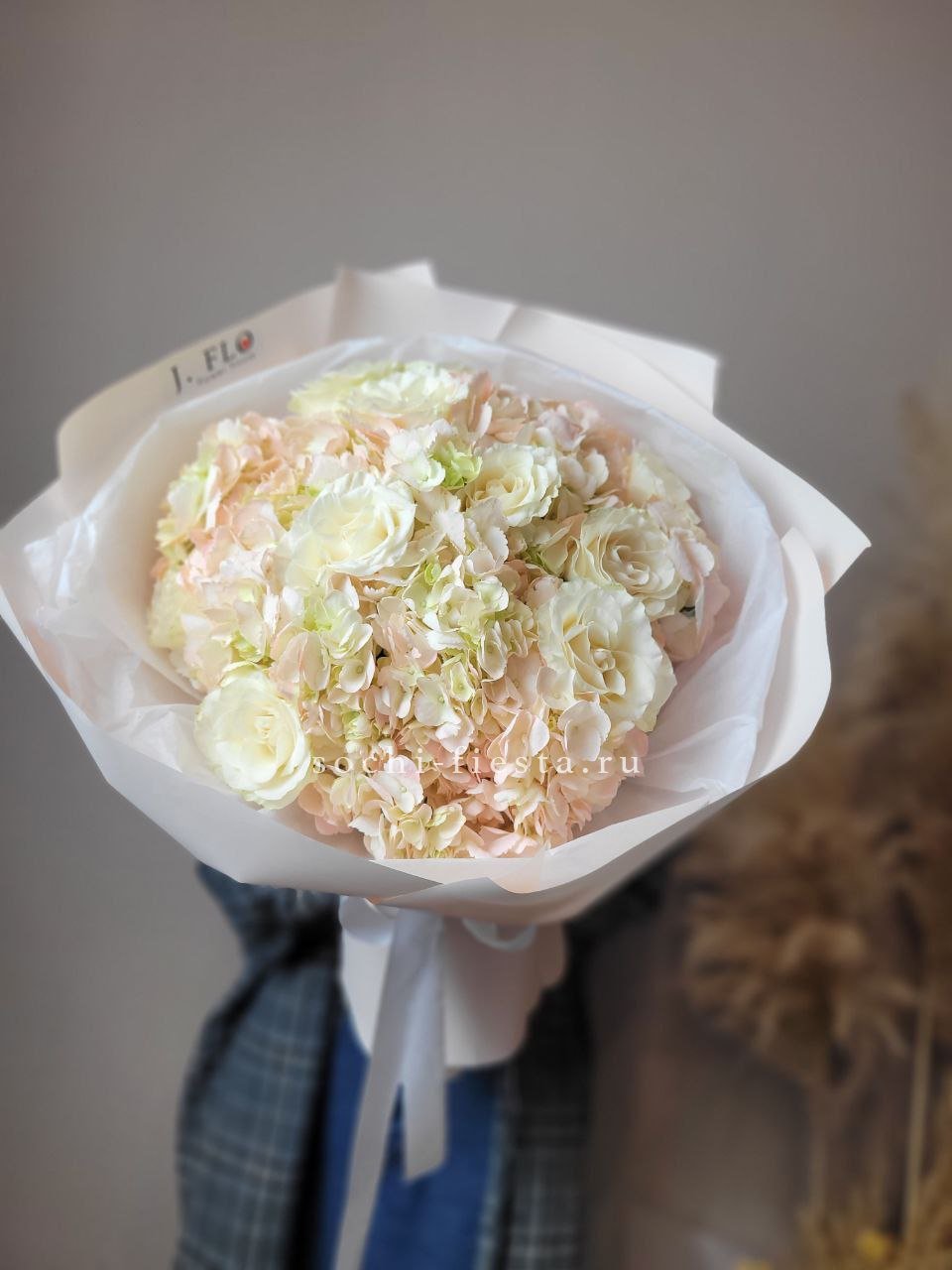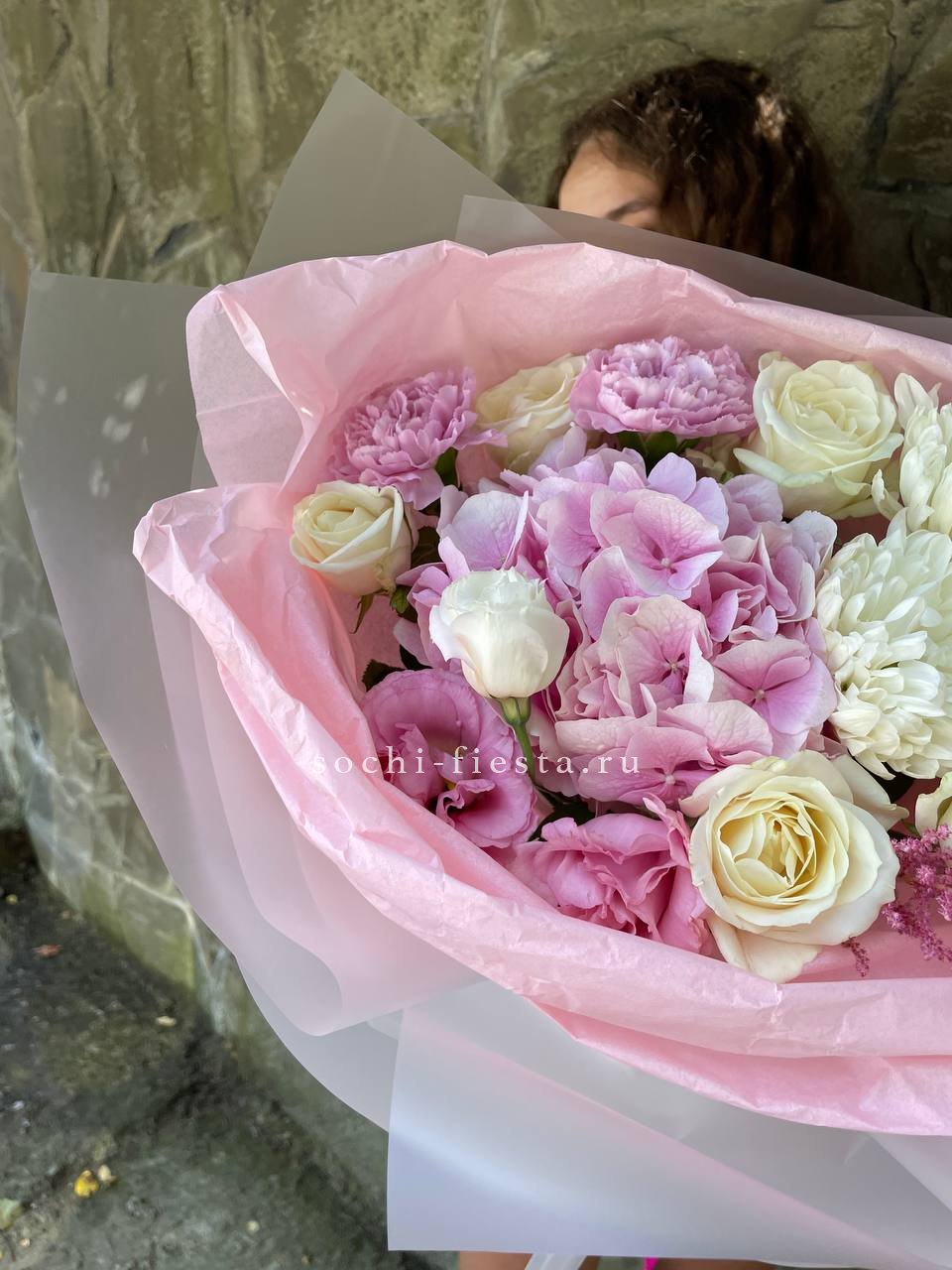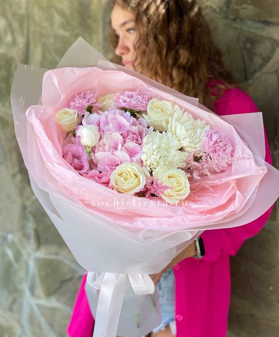 маттиола, розы, гортензия, диантусы, хризантемы , лента и дизайнерская пленка.
