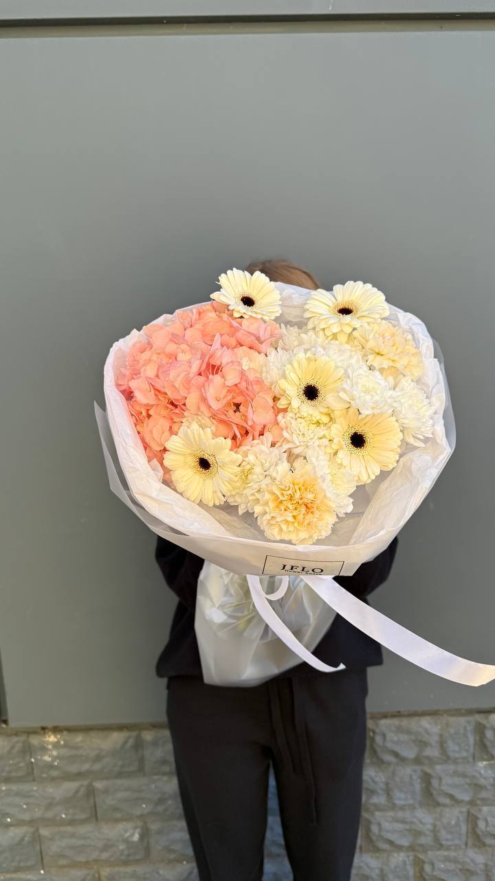 гортензия, маттиола, кустовые пионовидные розы Джульетта (аналог), хризантема кустовая, хлопок, лимониум (аналог), дизайнерская упаковка.