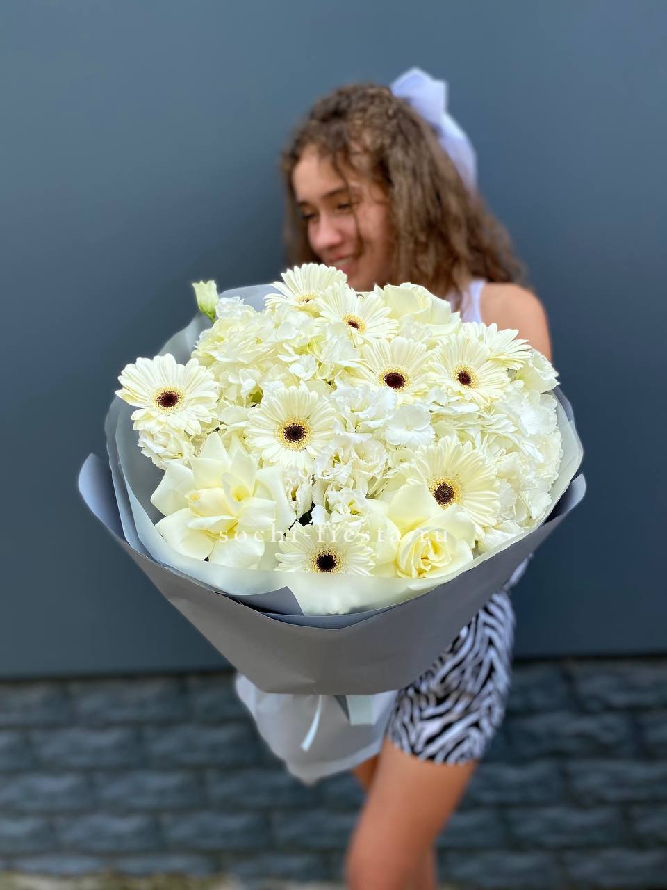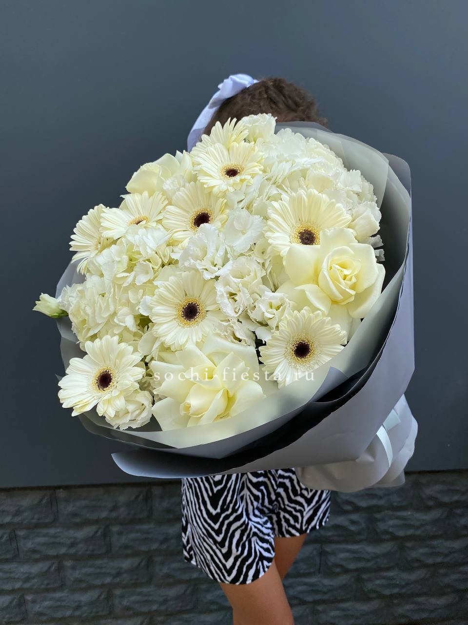 диантус, гербера, кустовая роза, роза белая, лимониум (замена в несезон), дельфиниум/маттиола/львиный зев/гладиолус (замена в несезон), лента, авторская упаковка.