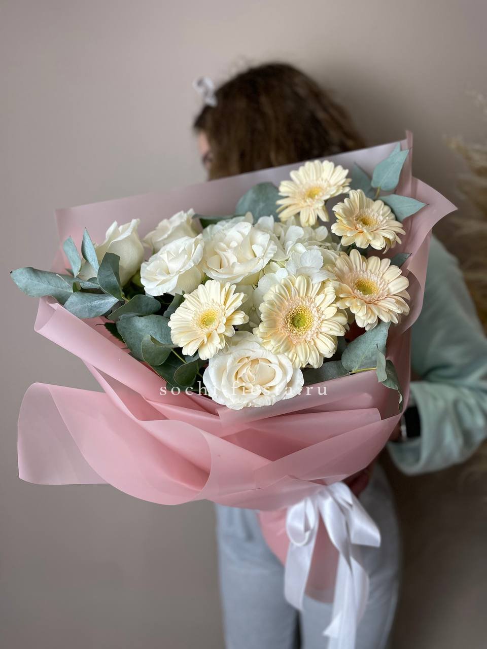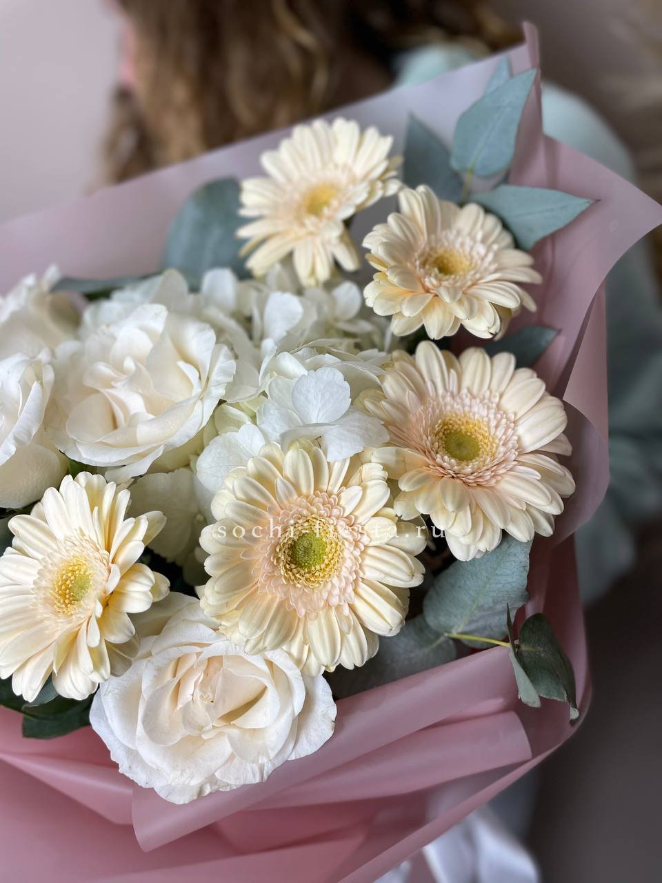гортензия, белая роза, диантус, хризантема, эустома, озатамус, пленка.