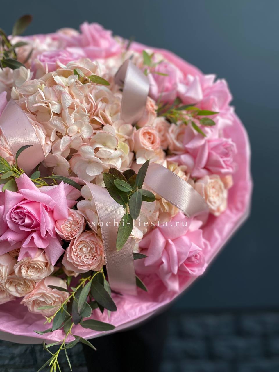 Воздушная композиция с крупными соцветиями гортензии и пышными розами создает ощущение легкости и объема. Эвкалипт добавляет свежести, а бомбастик расставляет яркие акценты между бутонами.