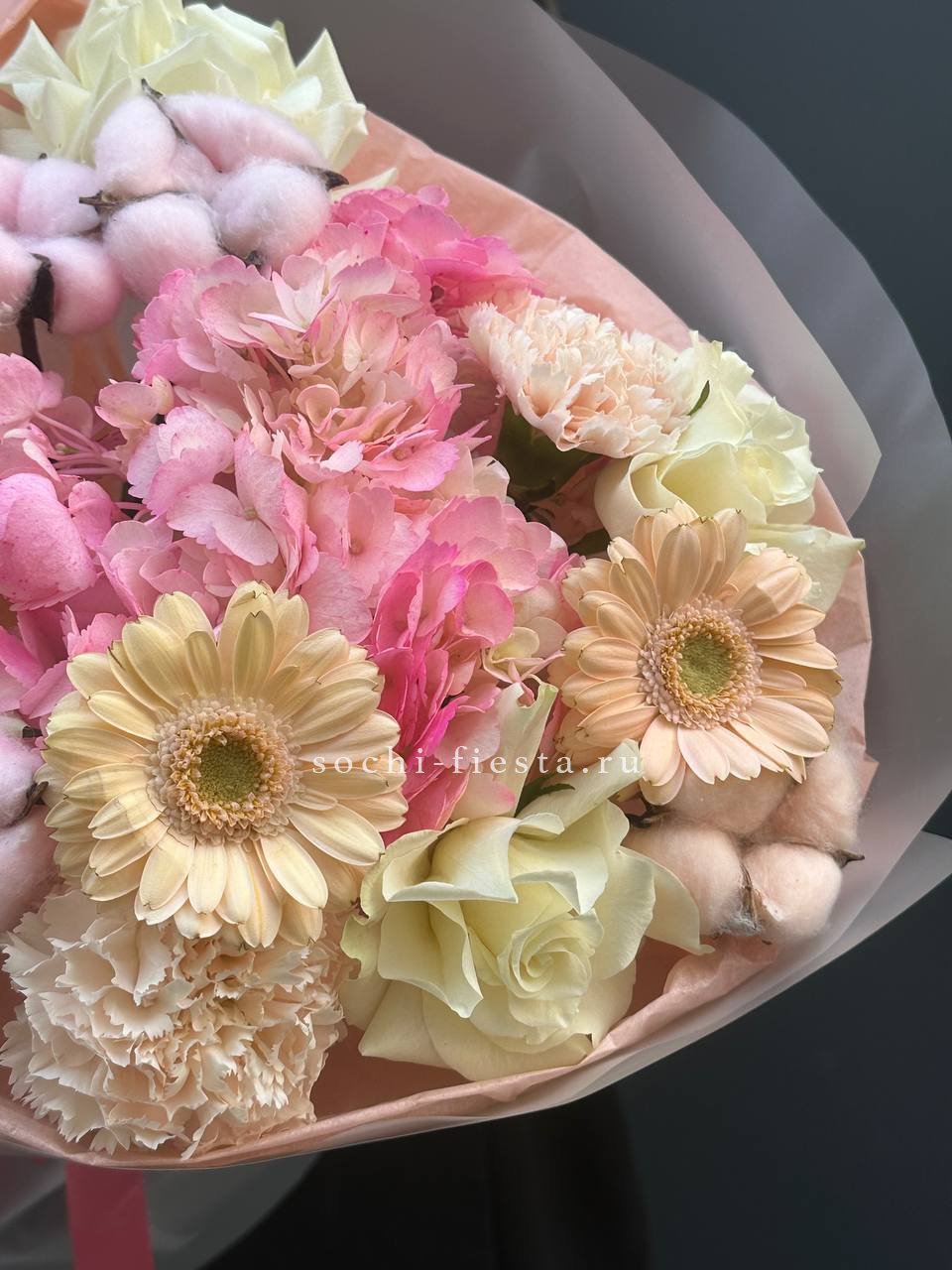 Пушистые соцветия гортензии сливаются с мягким хлопком и формируют объёмное облако. Герберы и диантусы вносят цветовые акценты, а розы завершают романтичную картину.