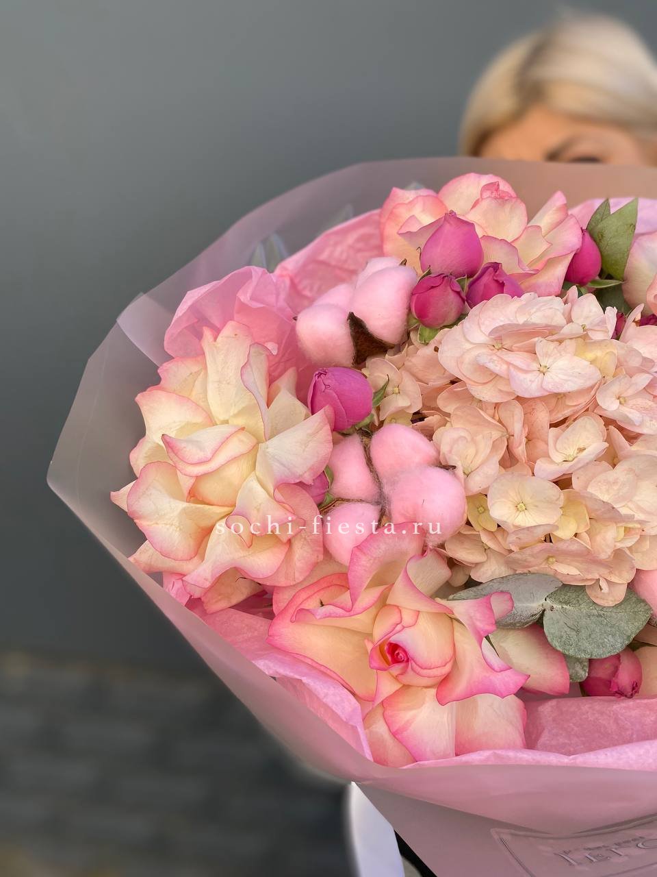 Крупные бутоны Джумилии соседствуют с воздушной гортензией и россыпью кустовых роз. Эвкалипт и хлопок создают спокойный фон для нежной палитры.