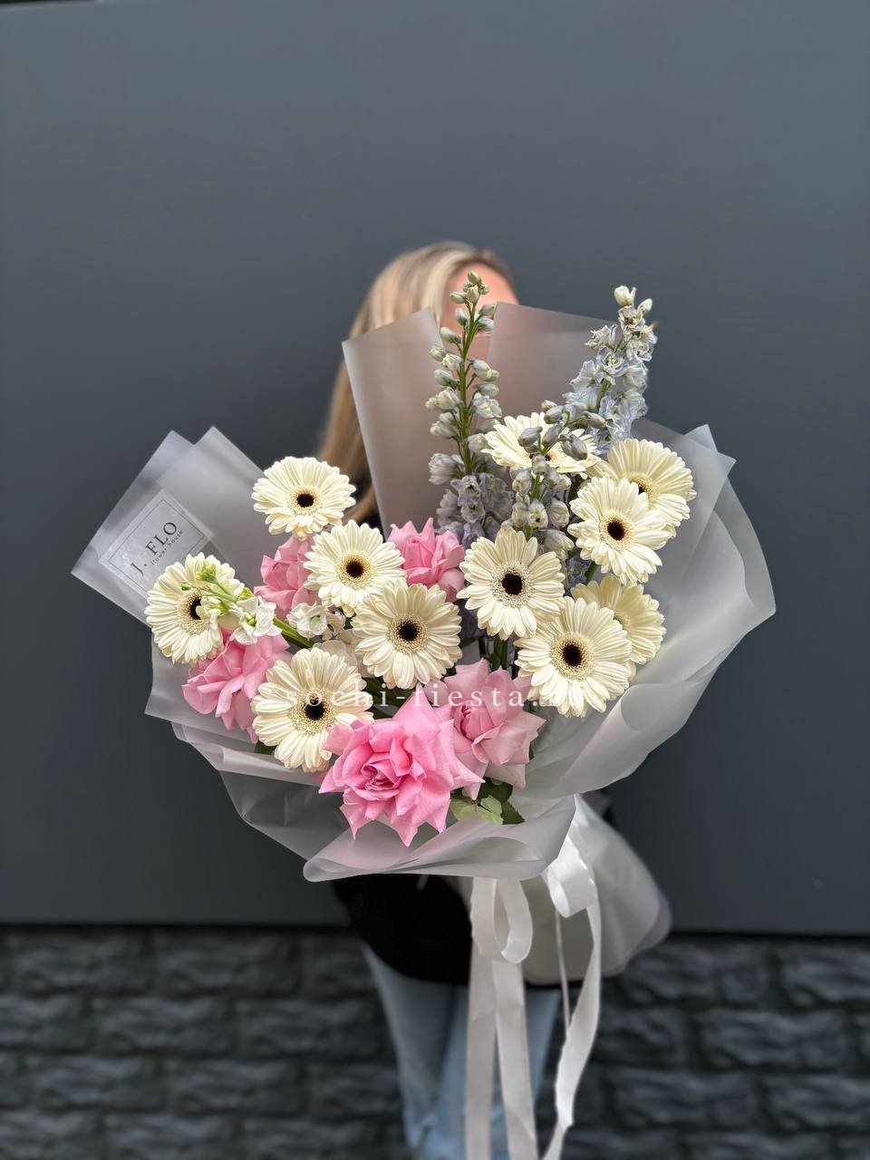 роза, герберы, дельфиниум (замена на маттиолу не в сезон), оформление.