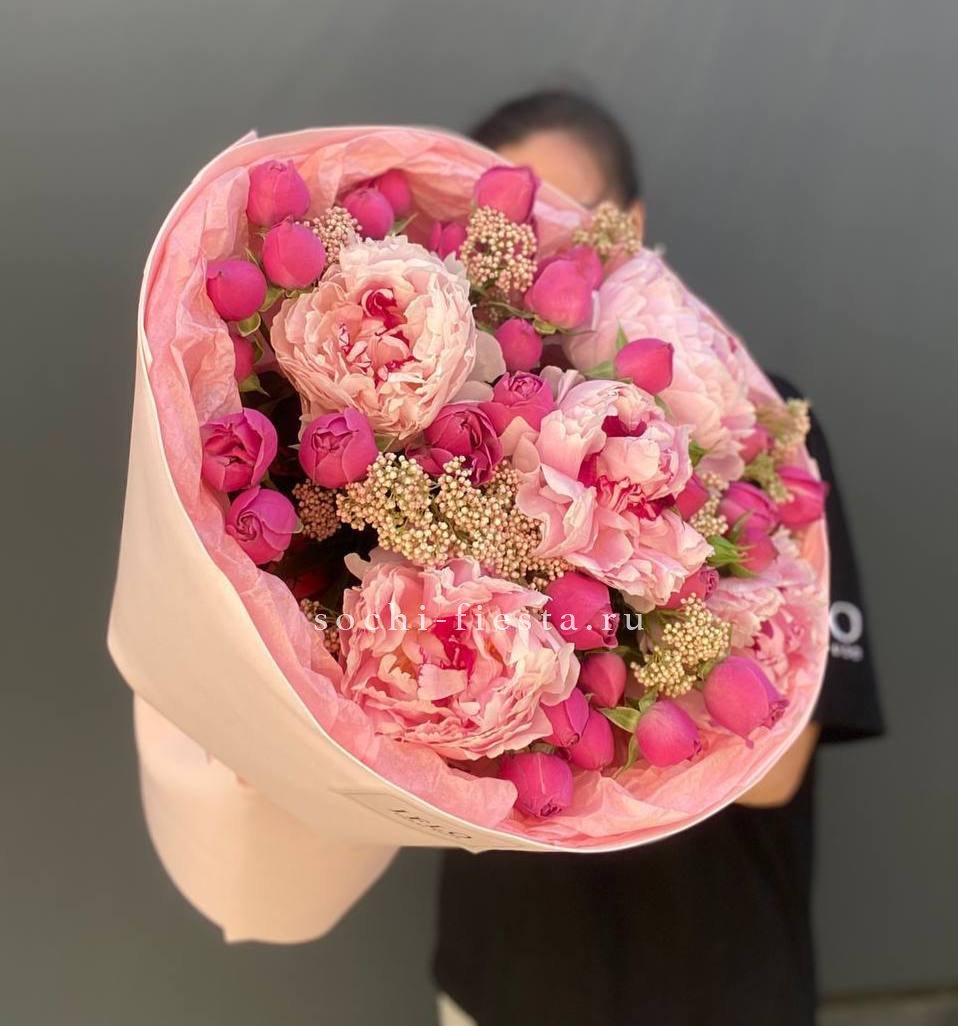 пионы, кустовые розы, озатамус , лента и дизайнерская пленка.