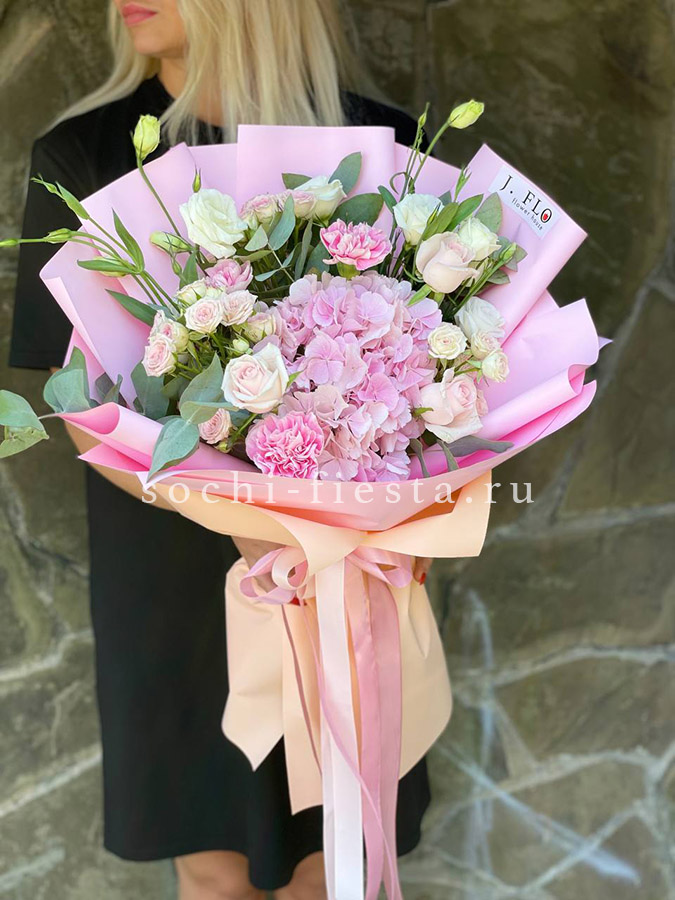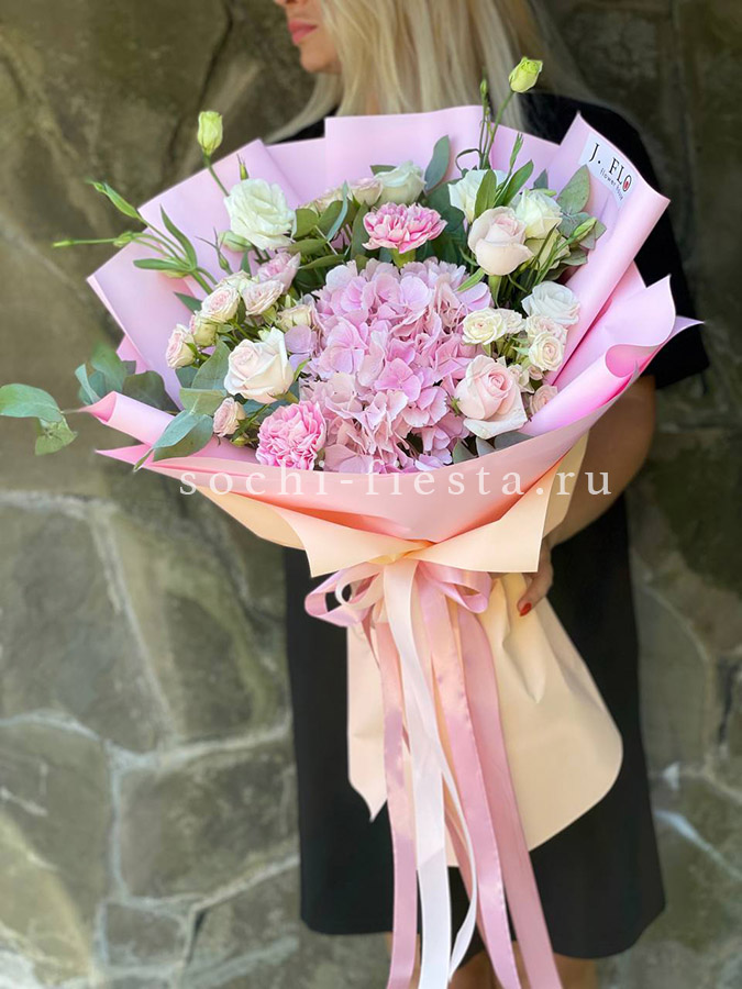 гортензия, пионовидная роза, озотамус, белая роза в нежном оформлении.