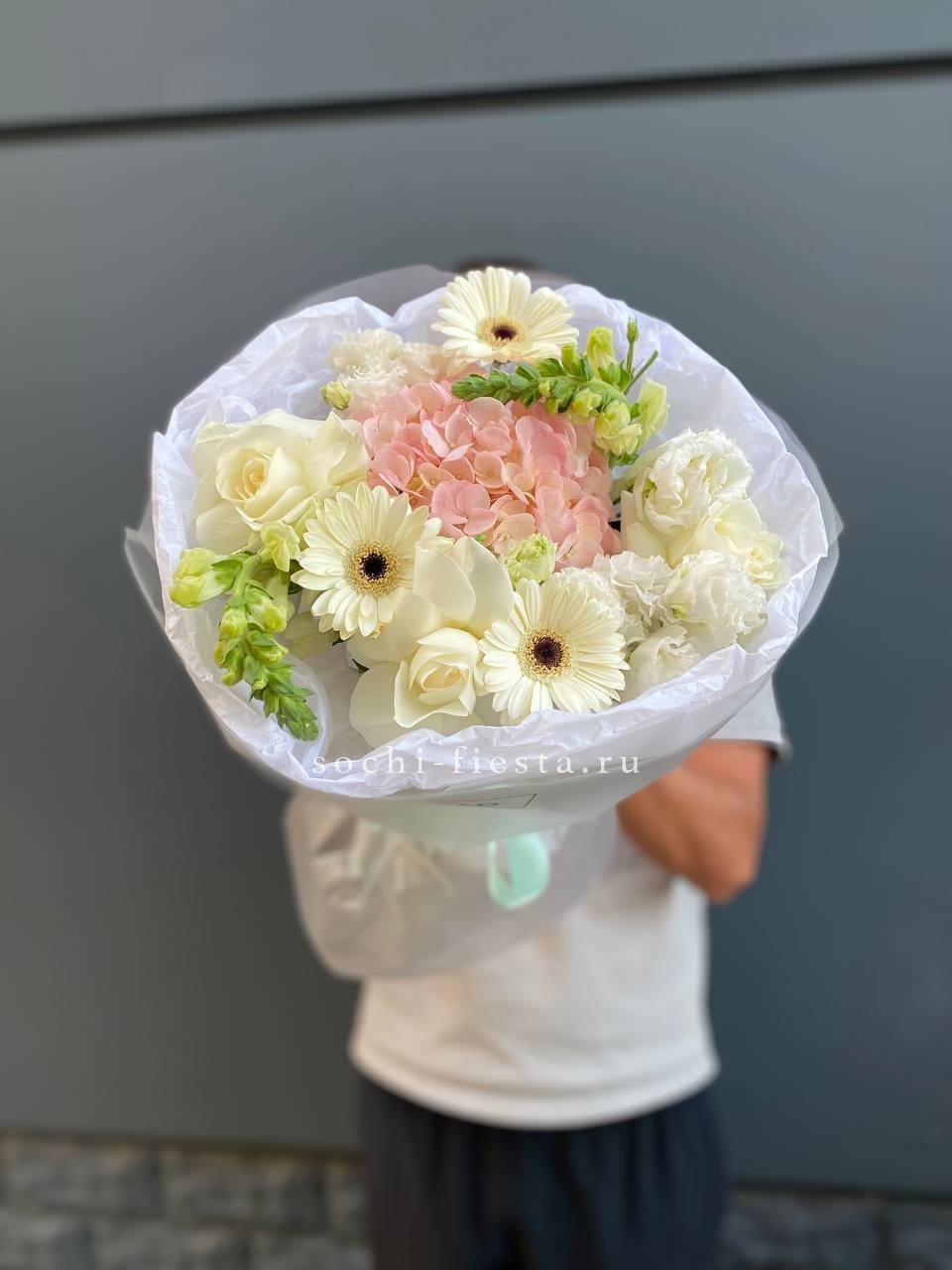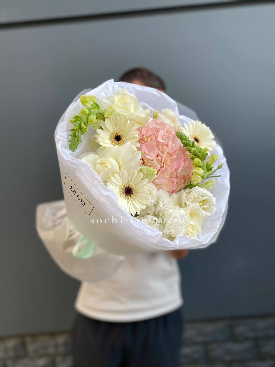 Воздушная гортензия окружена розовыми бутонами и душистой маттиолой. Лимониум добавляет букету лёгкую дымку, а общий силуэт остаётся мягким и собранным.