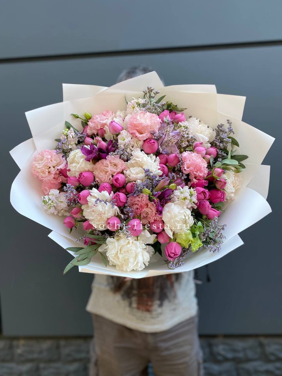 пионы (или аналог вне сезона), лимониум, маттиола, мисти баблс, эустома, эвкалипт, лента, упаковка.