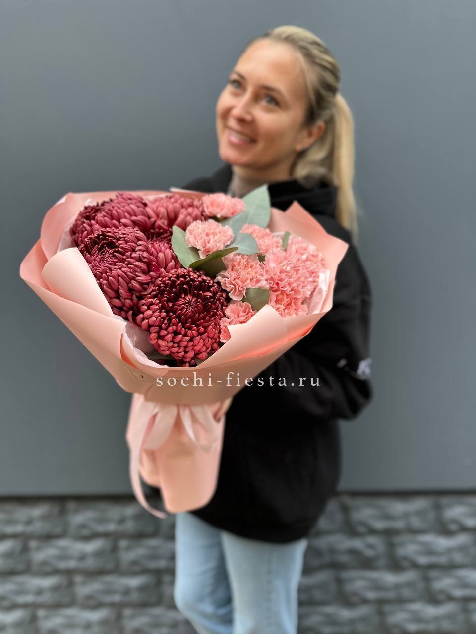 Диантусы и бигуди собраны в плотную форму с чёткими линиями. Эвкалипт задаёт вертикальный ритм и добавляет свежести. Композиция выглядит графично и современно.
