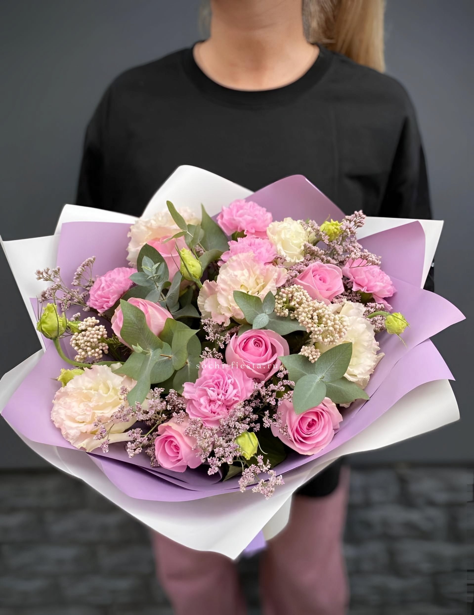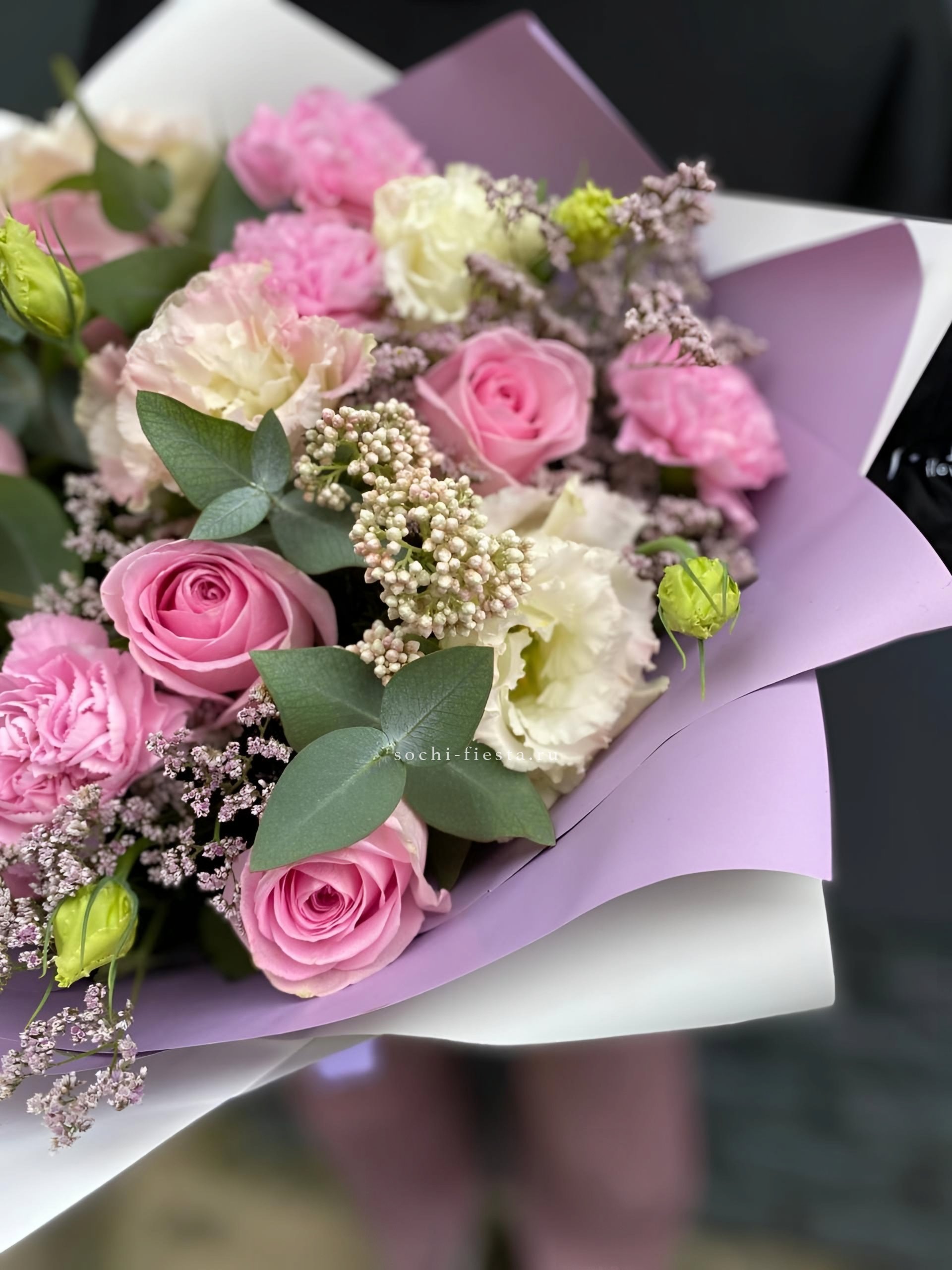 розовые розы, белые розы, диантус, бомбастик, гортензия, эвкалипт, пленка.