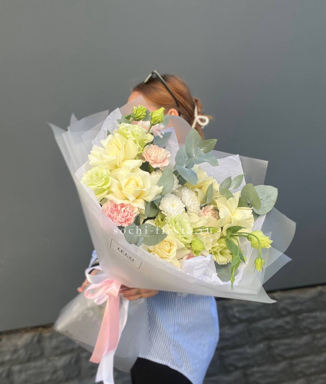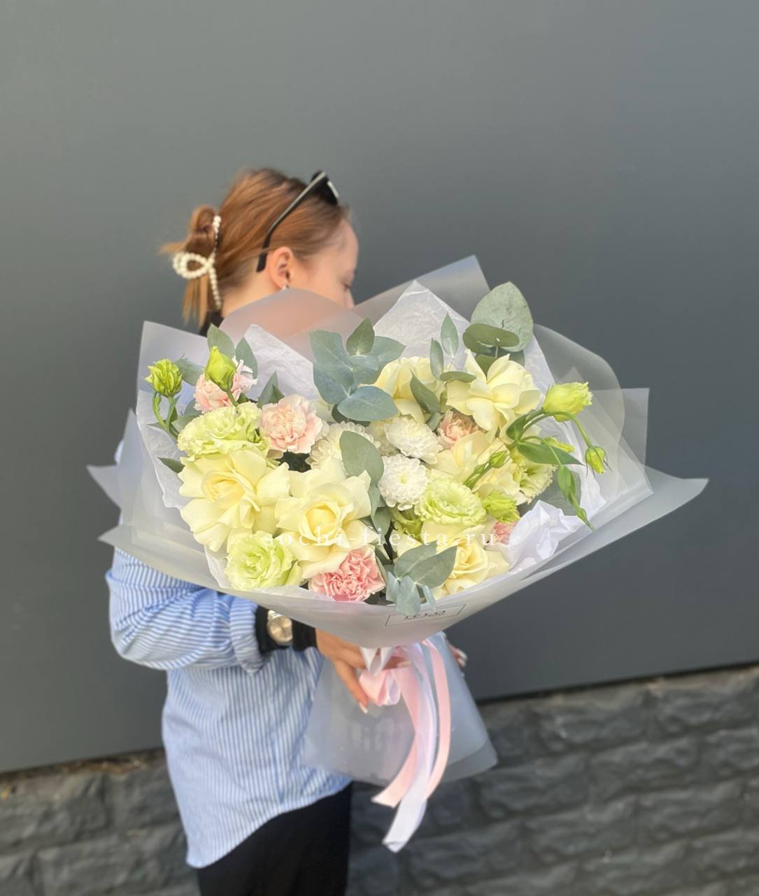 хризантемы, диантусы, розы, эустома, гортензия, лента, корейская пленка.