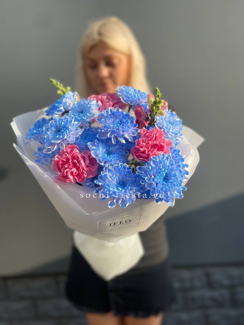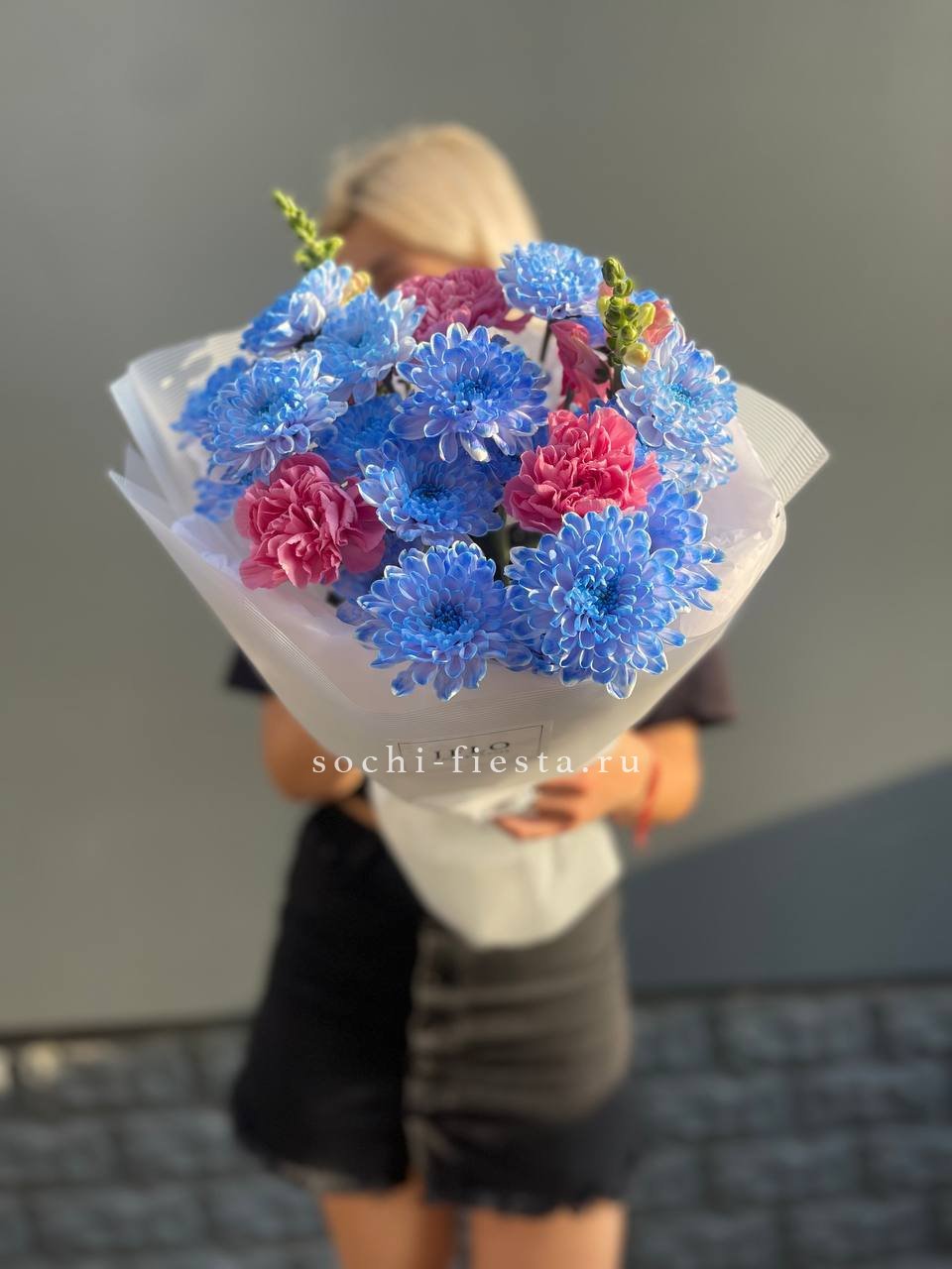 Букет объединяет хризантемы, диантусы, розы, эустому и гортензию в плотную композицию. Корейская пленка удерживает форму и создает графичный силуэт с четкими границами.