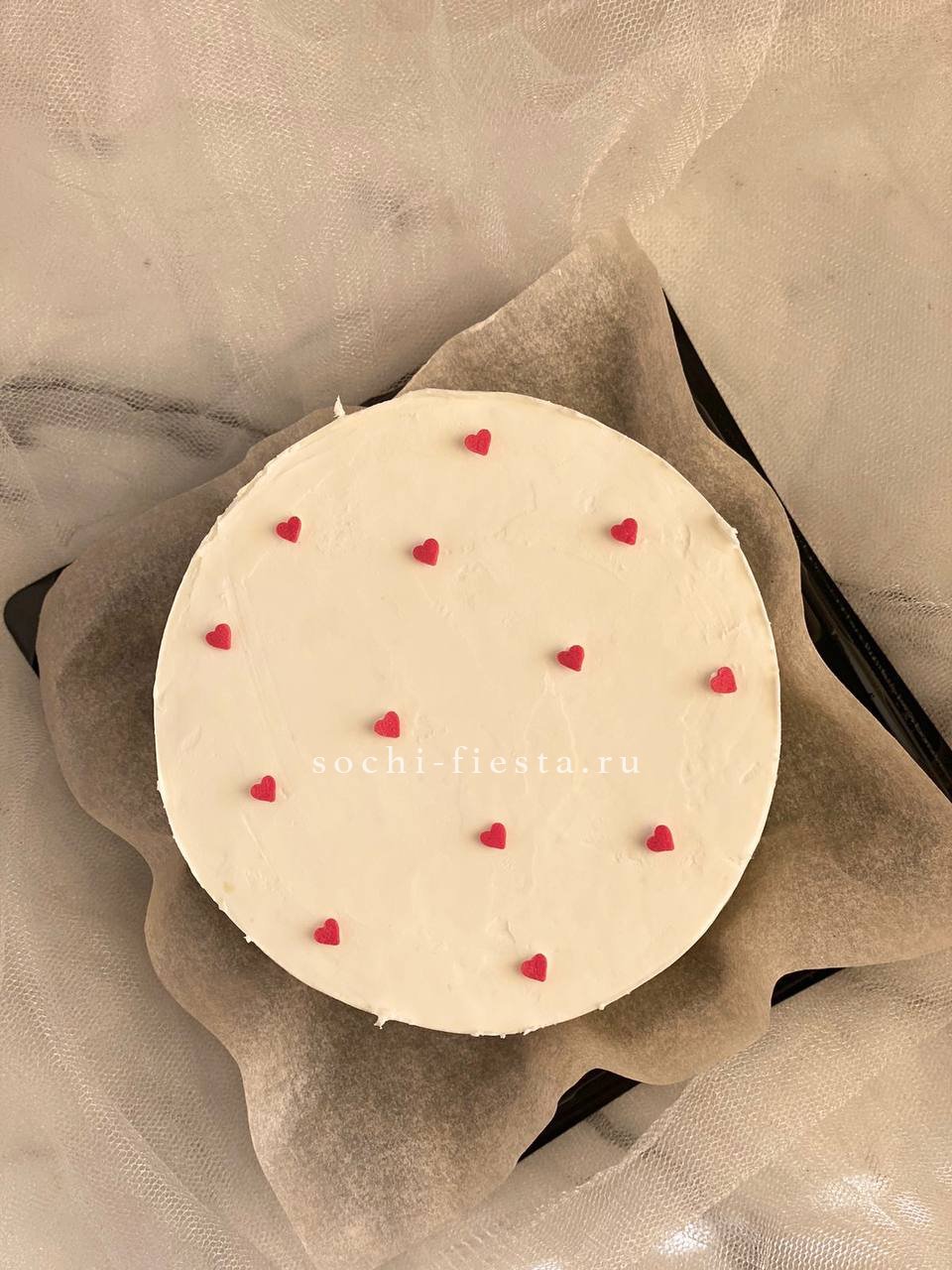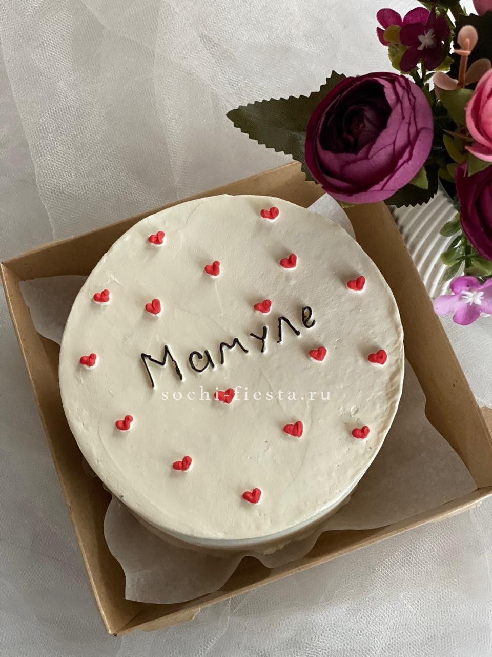 Компактный десерт ручной работы с весенним оформлением в красно-белой гамме. Кремовая текстура и графичный декор создают праздничное настроение. Два варианта начинки позволяют выбрать любимый вкус.